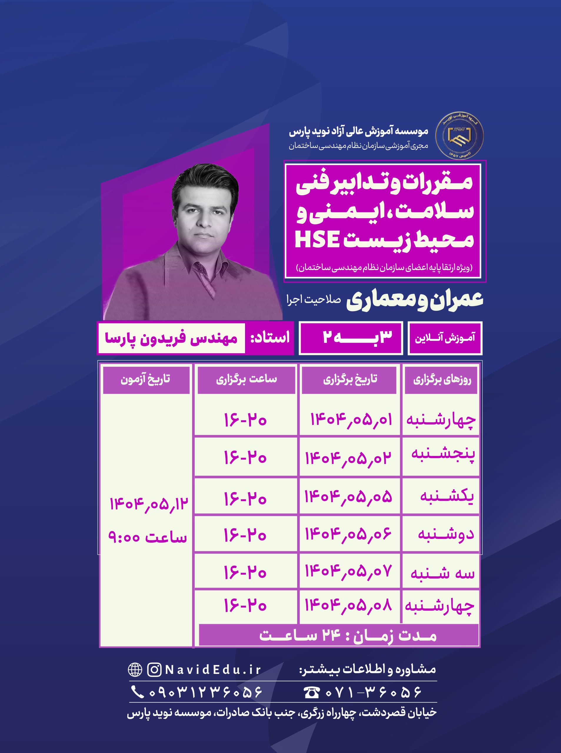 کد دوره: ۱۳۲۲۳    نام استاد: آقای مهندس فریدون پارسا   تاریخ شروع: ۱۴۰۴/۰۵/۰۱    تاریخ آزمون(حضوری): ۱۴۰۴/۰۵/۱۲