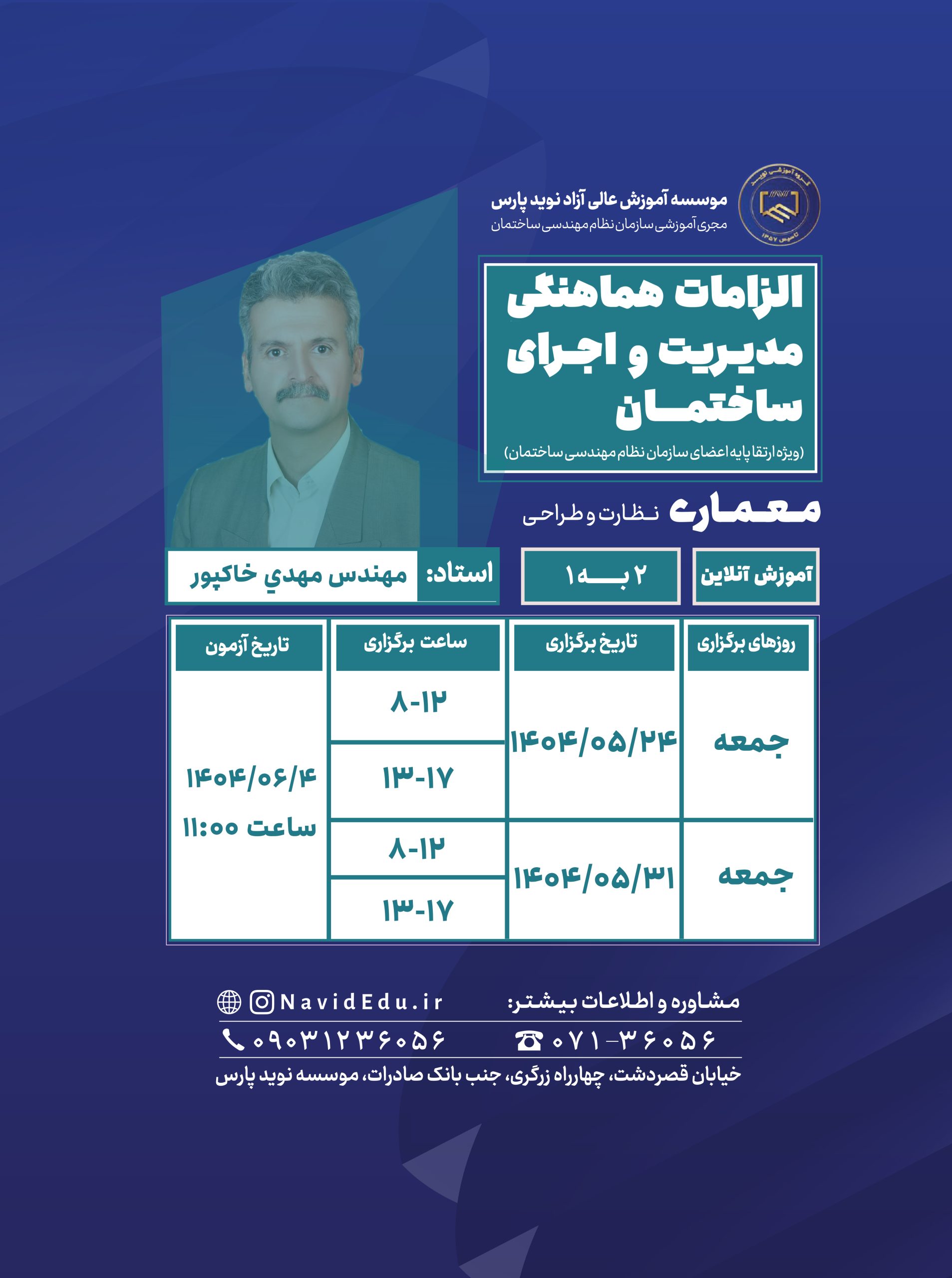 - عطف به نامه شماره ۹۳۲۷/۴۲۰ مورخ ۱۴۰۱/۰۱/۲۷ دفترمقررات ملی ساختمان و لزوم برگزاری حضوری آزمون های پایان دوره، کلاس های این دوره به صورت آنلاین و آزمون پایانی دوره مذکور به صورت حضوری و با لزوم رعایت پروتکل های بهداشت فردی توسط شرکت کنندگان (استفاده ازماسک) در محل موسسه برگزار خواهد گردید.